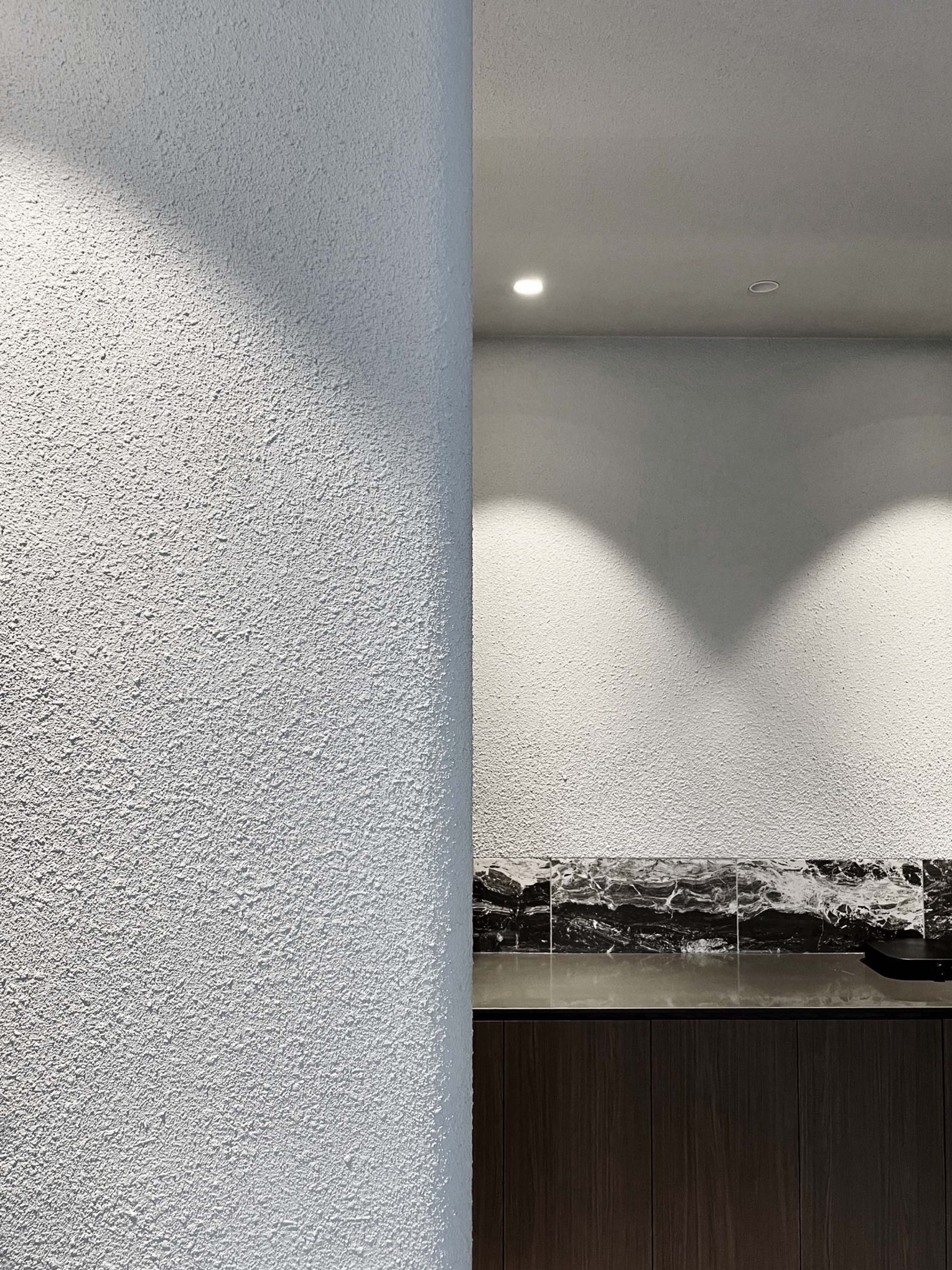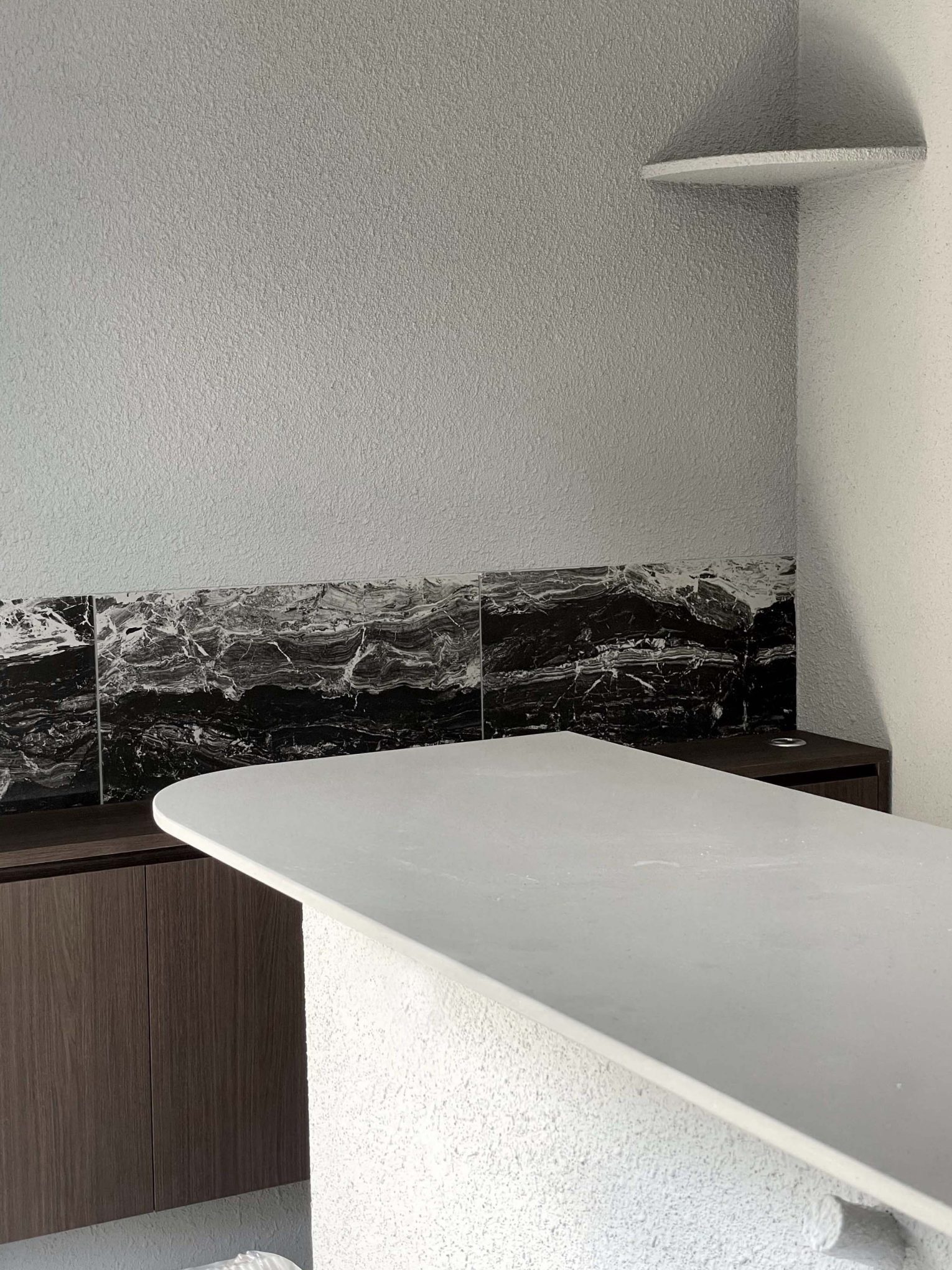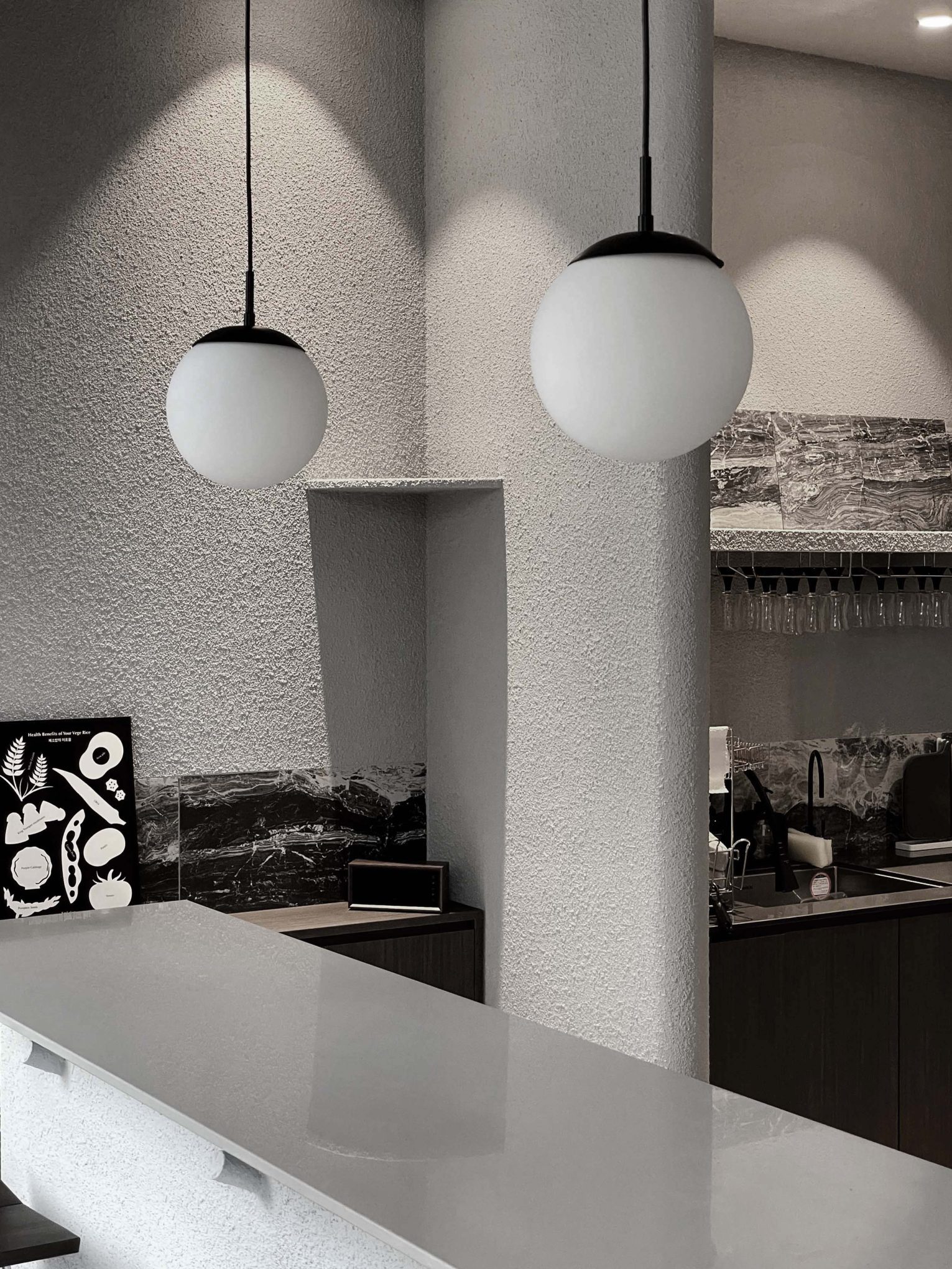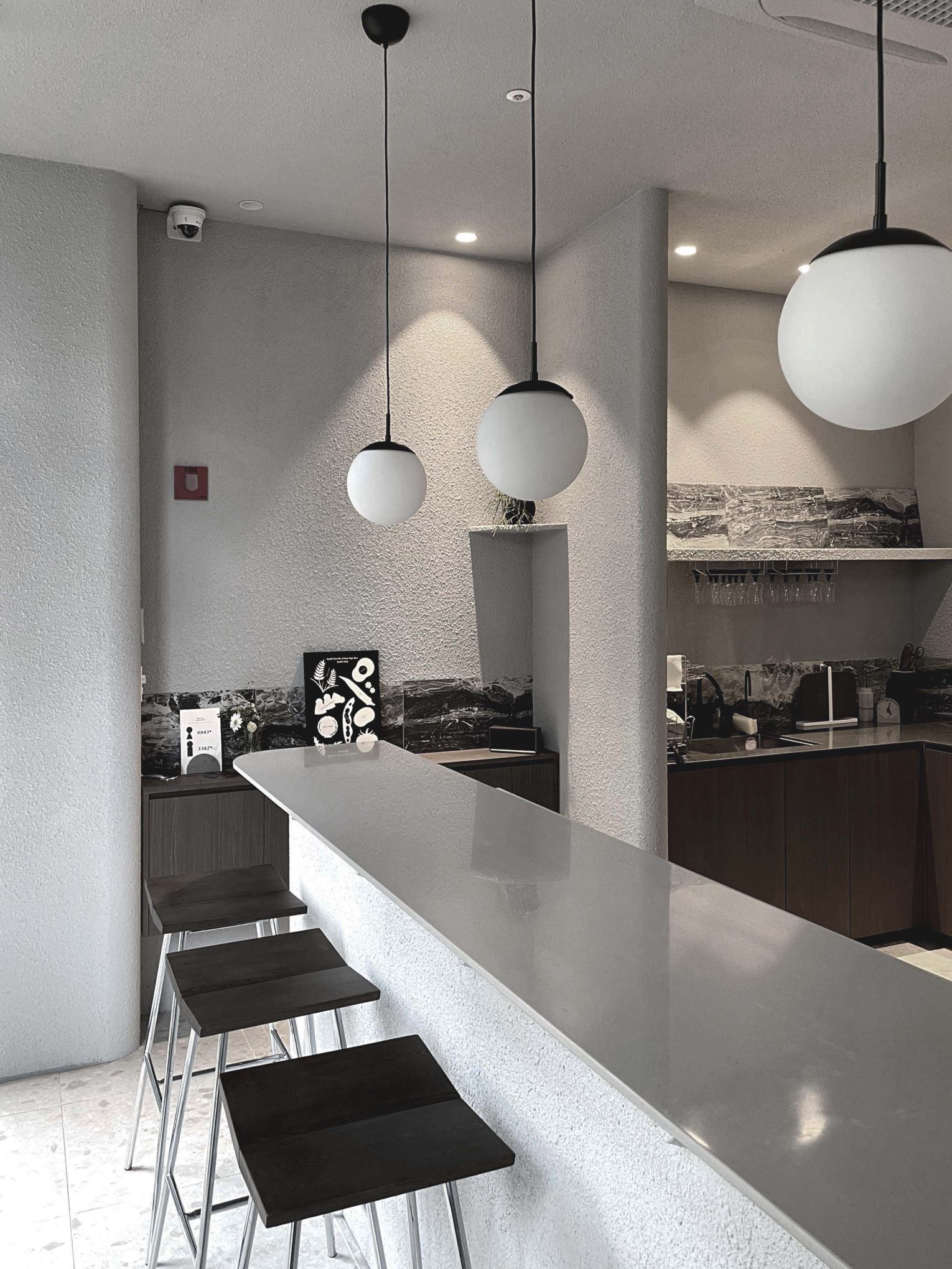공간은 무채색 계열을 중심으로 정제된 분위기를 연출하되, 텍스처가 있는 벽면과 짙은 목재 수납장으로 공간의 밸런스를 잡고 오픈 키친과 바 테이블 구조로 효율적인 동선과 고객 응대를 고려했습니다.