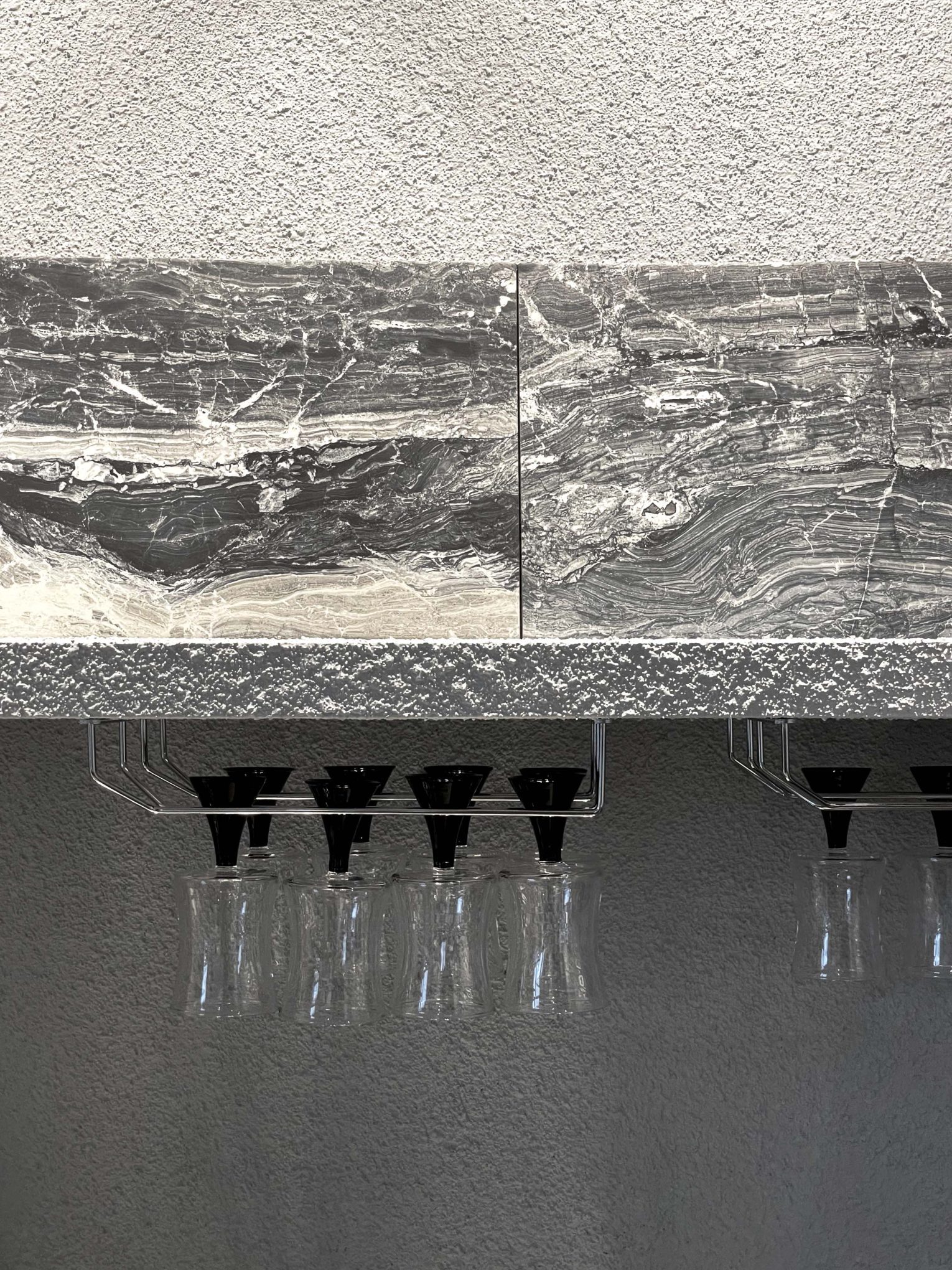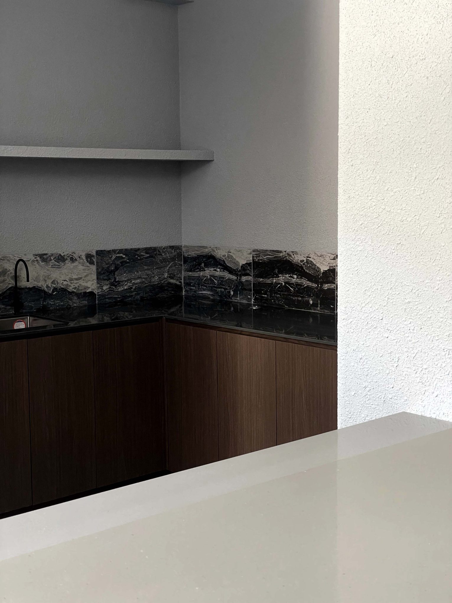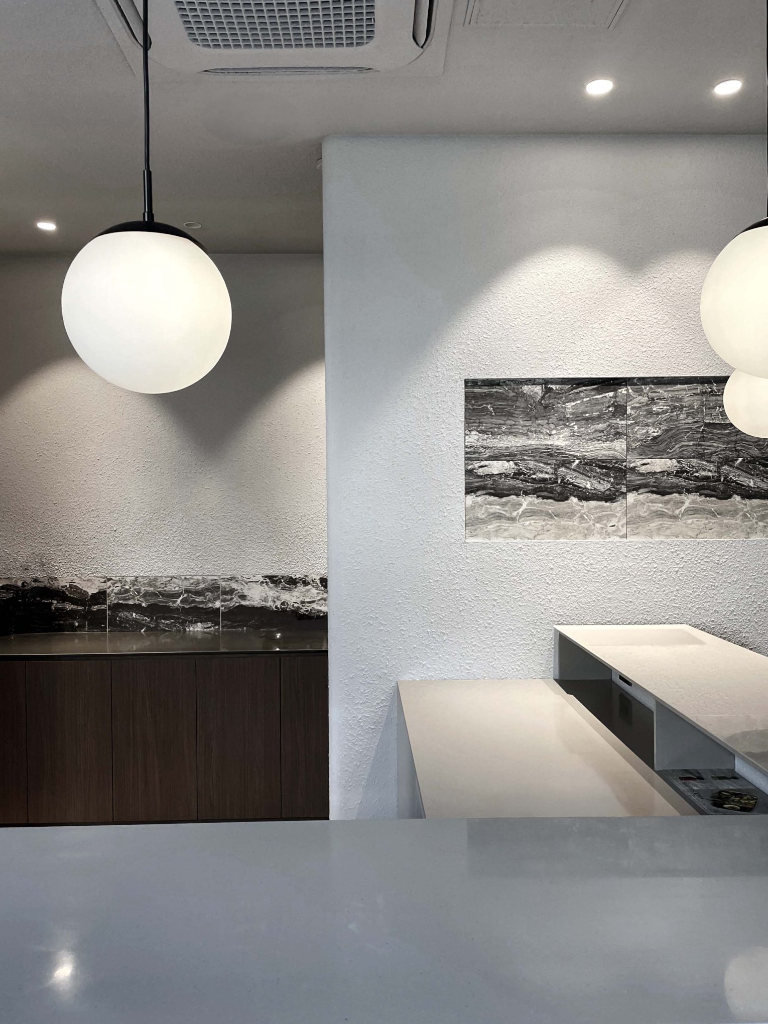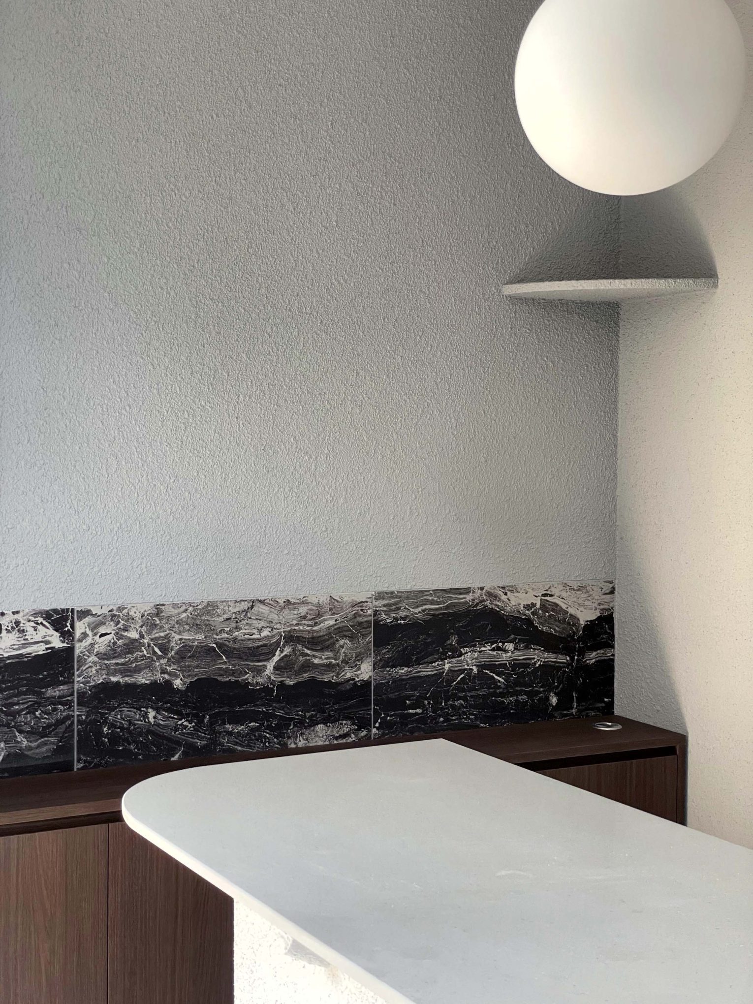공간은 무채색 계열을 중심으로 정제된 분위기를 연출하되, 텍스처가 있는 벽면과 짙은 목재 수납장으로 공간의 밸런스를 잡고 오픈 키친과 바 테이블 구조로 효율적인 동선과 고객 응대를 고려했습니다.