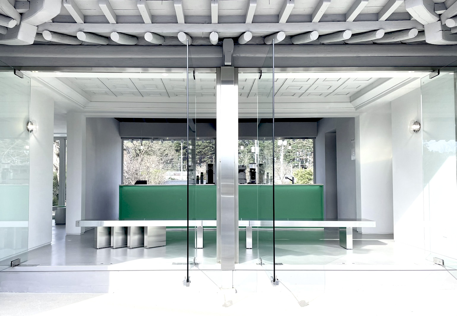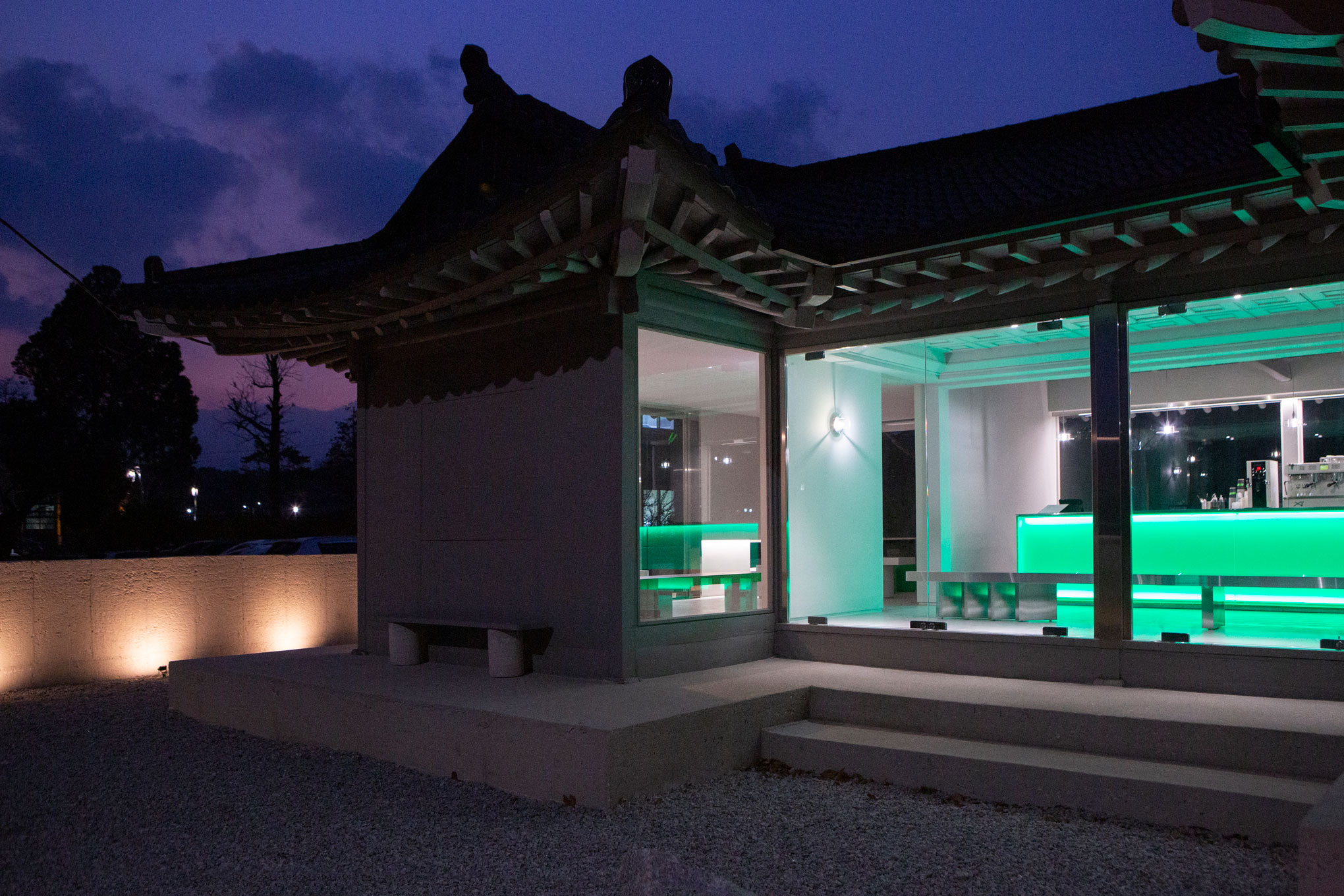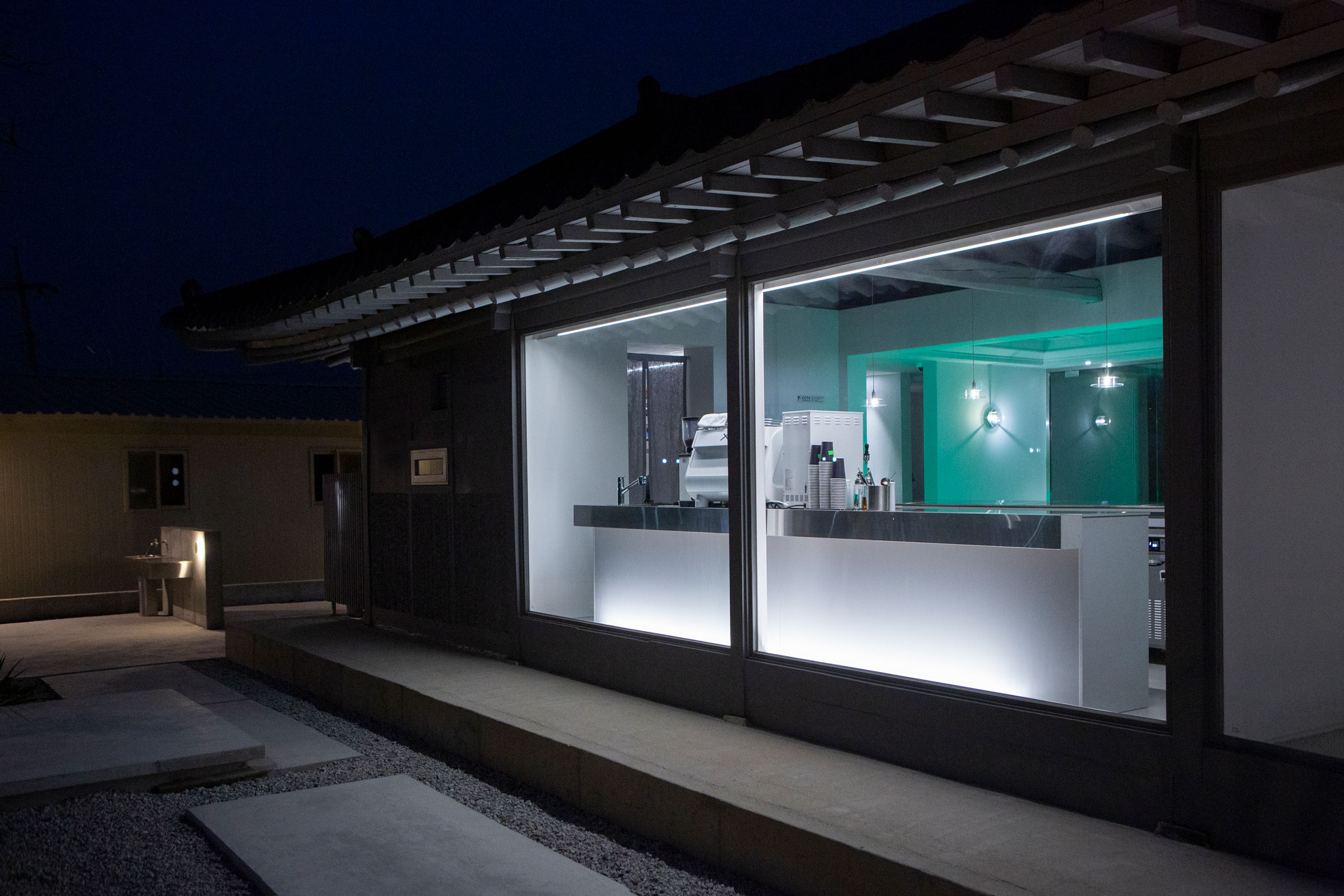 기존 목재의 따뜻한 색을 제거하고 스테인리스, 유리, 매트한 마감재를 활용해 공간의 물성과 분위기를 전환했습니다. 전통 목구조는 그대로 유지하되, 이를 감싸는 재료와 빛의 방식만을 달리해 건축의 골격과 새로운 질감 사이에서 균형을 만들어갔습니다.