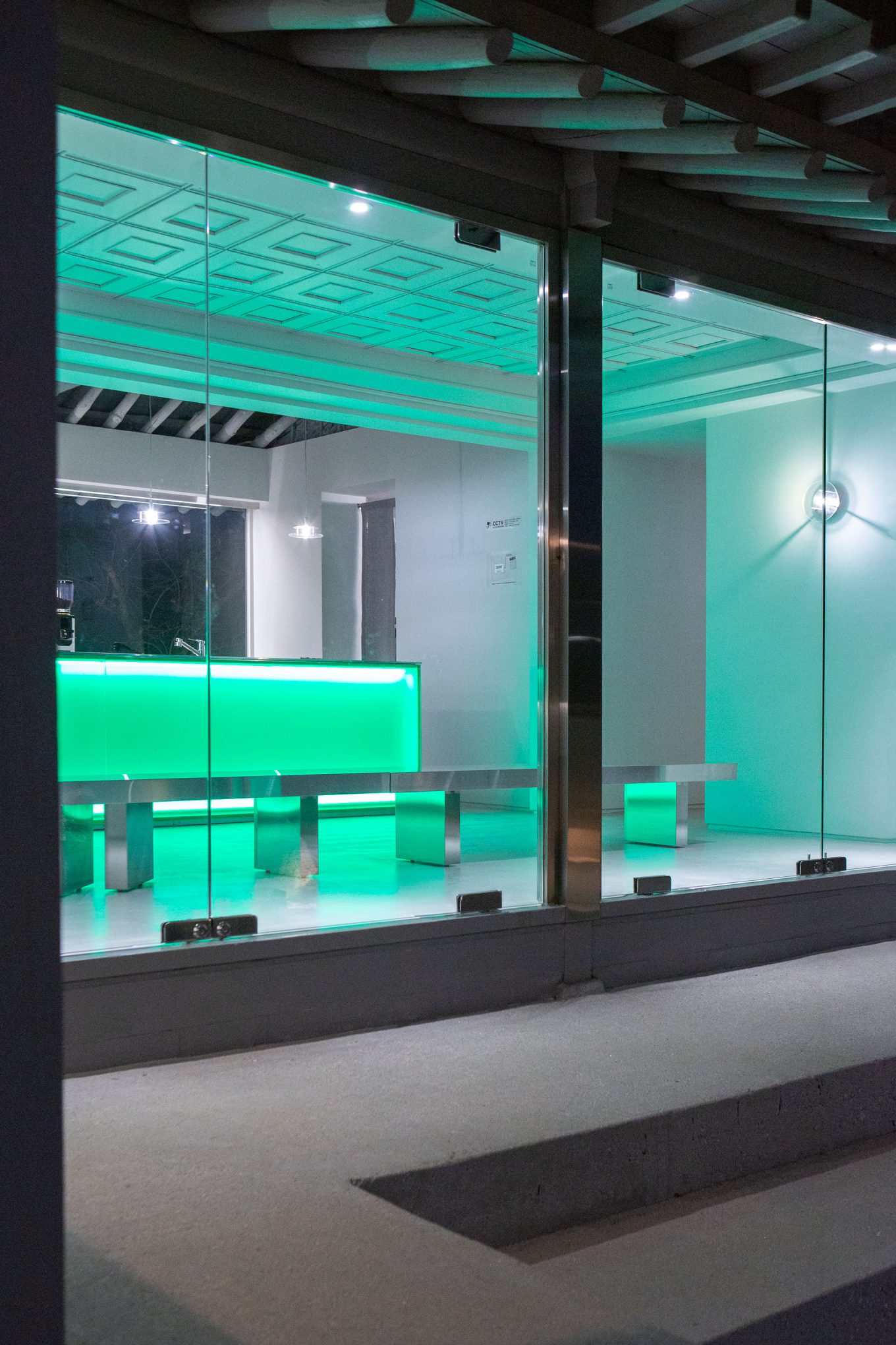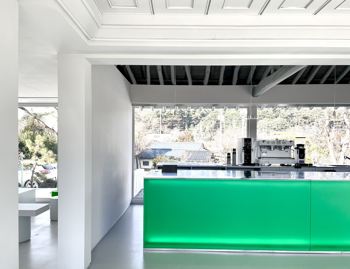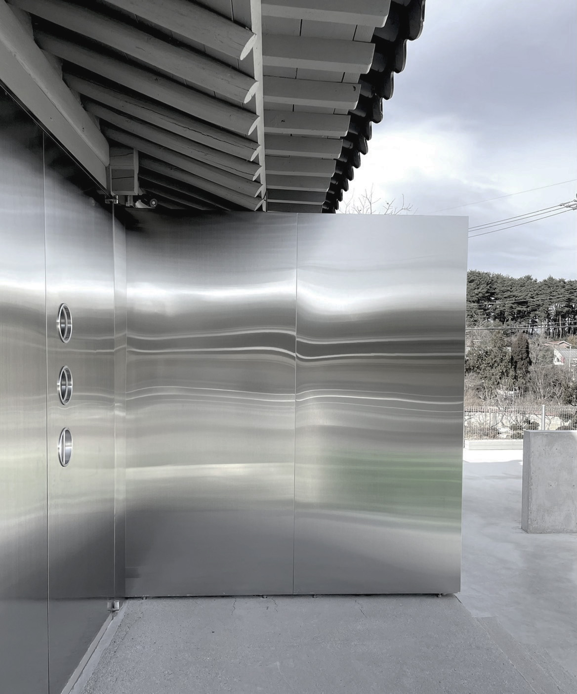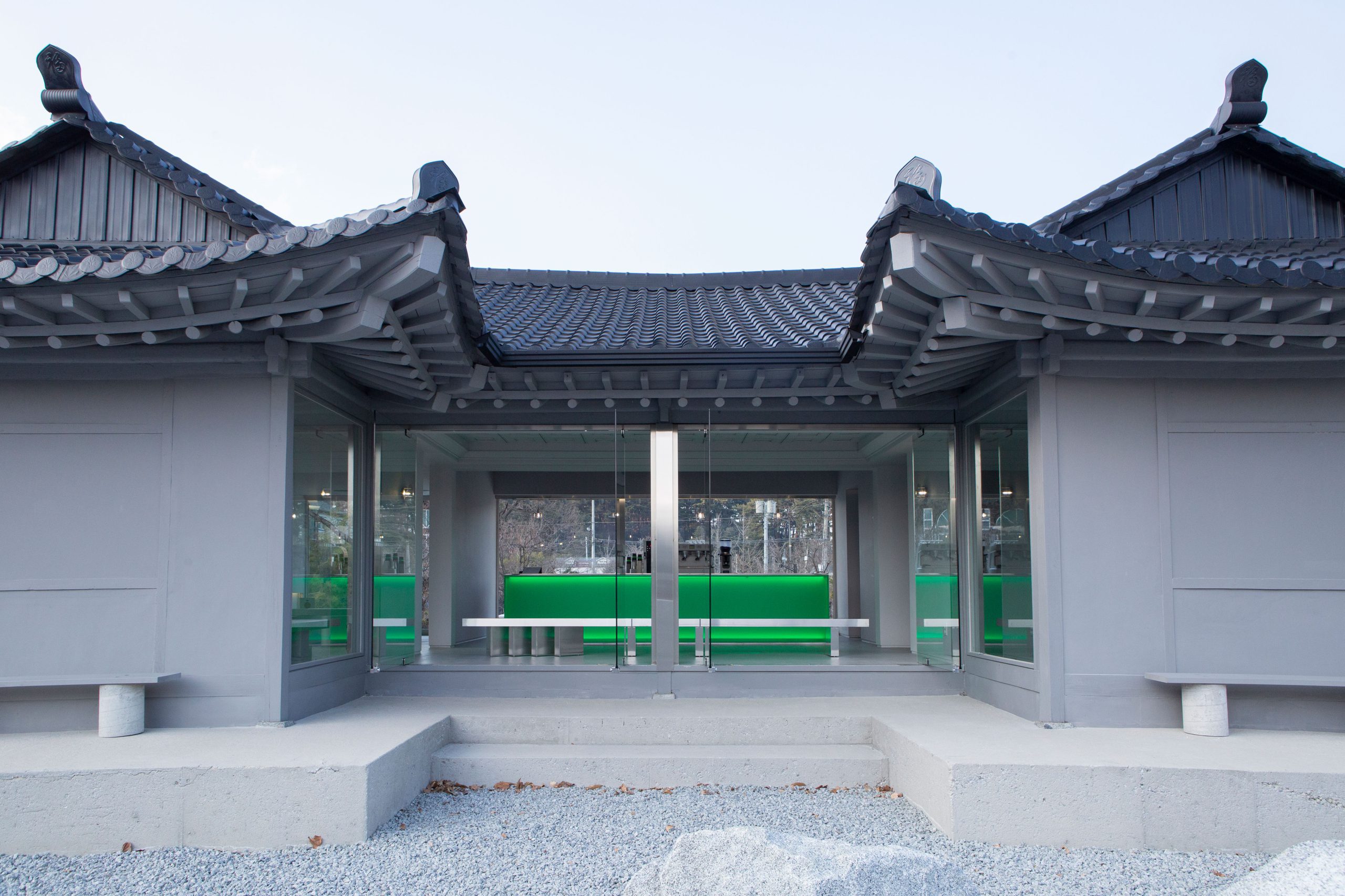 기존 목재의 따뜻한 색을 제거하고 스테인리스, 유리, 매트한 마감재를 활용해 공간의 물성과 분위기를 전환했습니다. 전통 목구조는 그대로 유지하되, 이를 감싸는 재료와 빛의 방식만을 달리해 건축의 골격과 새로운 질감 사이에서 균형을 만들어갔습니다.