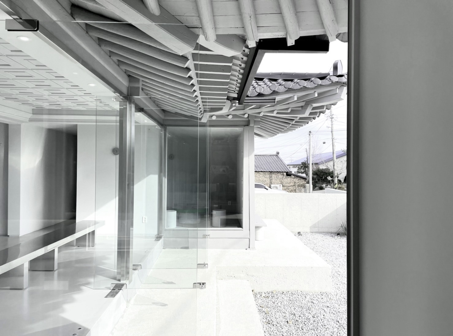전통 목구조는 그대로 유지하되, 이를 감싸는 재료와 빛의 방식만을 달리해 건축의 골격과 새로운 질감 사이에서 균형을 만들어갔습니다.